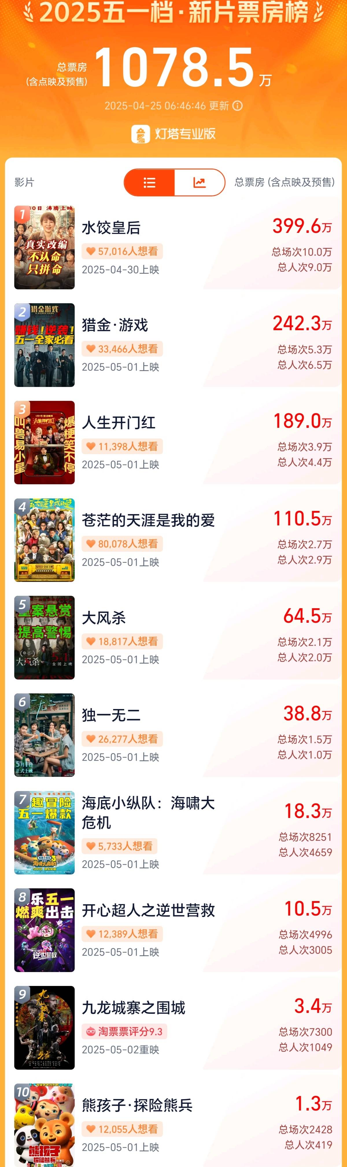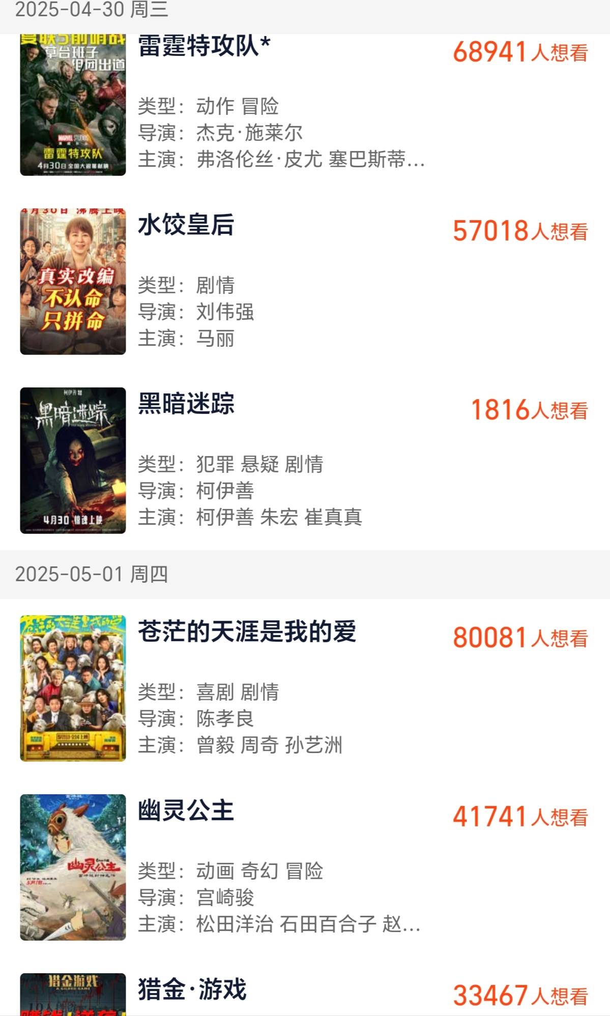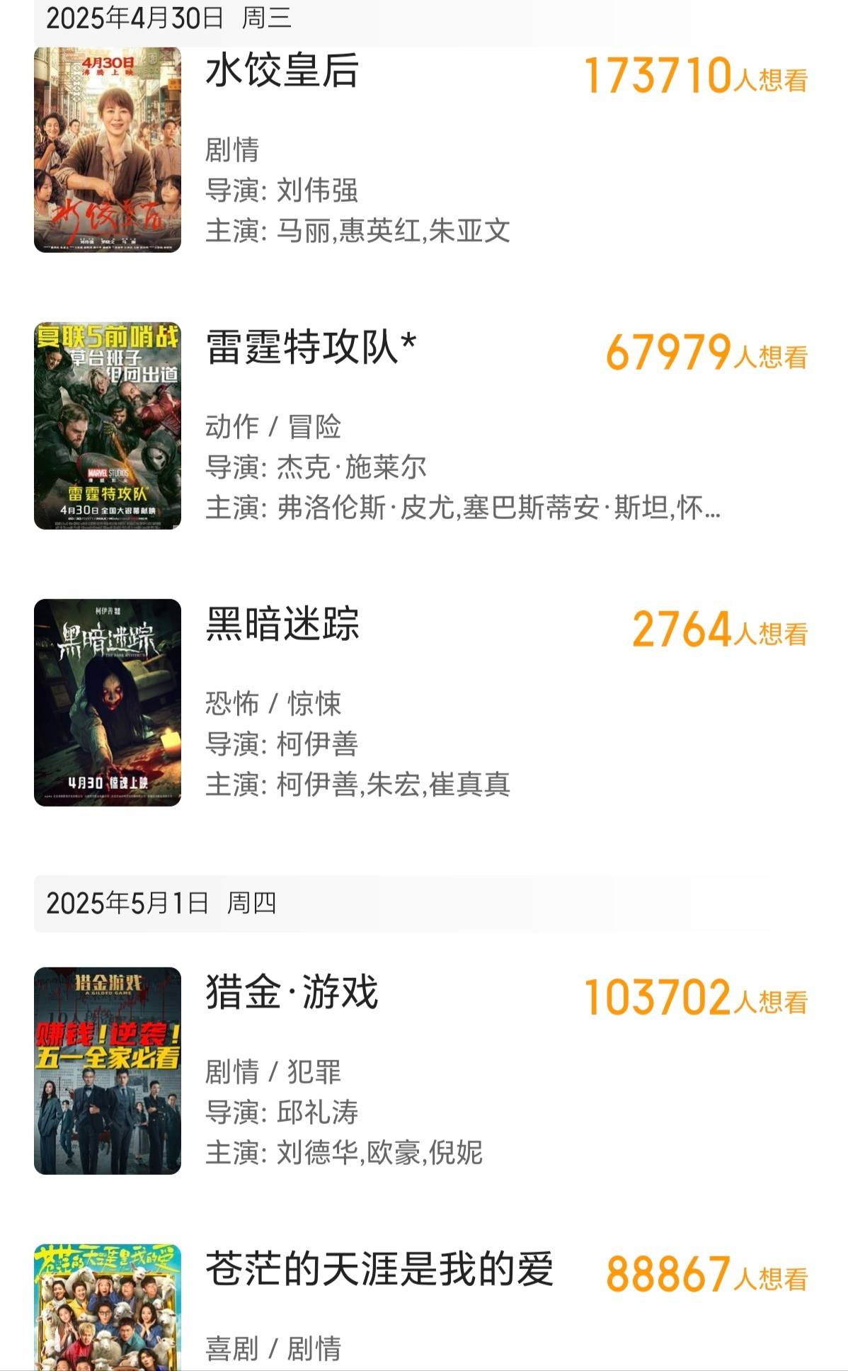 今年五一档猫眼想看人数排前五的是《水饺皇后》《猎金·游戏》《苍茫的天涯是我的爱》《雷霆特工队*》《人生开门红》,淘票票想看人数排前五的是《苍茫的天涯是我的爱》《雷霆特工队*》《水饺皇后》《幽灵公主》《猎金·游戏》。