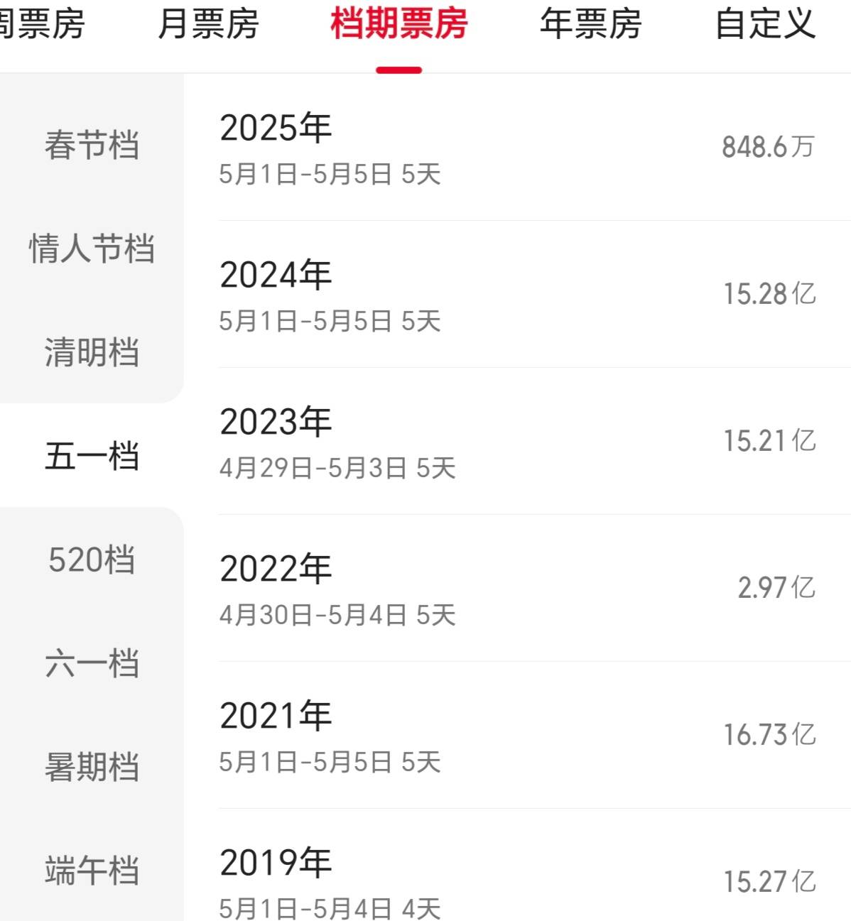 过去几年五一档,大盘票房都在15亿以上(受疫情影响的2022年除外),2019年4天15.27亿元、2021年5天16.73亿元、2023年五天15.21亿元、2024年五天15.28亿元。