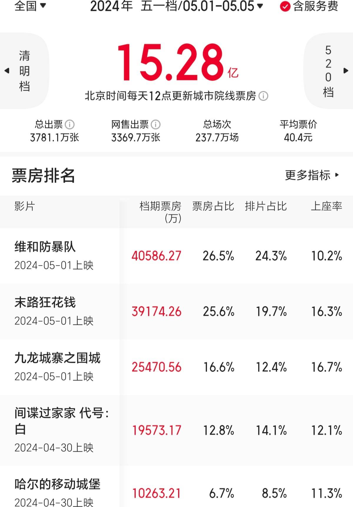 2024年五一档就是一种相对较理想的状态,八部电影上映,前五名《维和防暴队》《末路狂花钱》《九龙城寨之围城》《间谍过家家 代号:白》《哈尔的移动城堡》的票房分别约4亿、3.9亿、2.5亿、2亿、1亿。